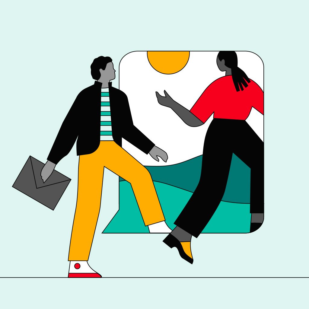 Illustration of three diverse people interacting on elevated surfaces.